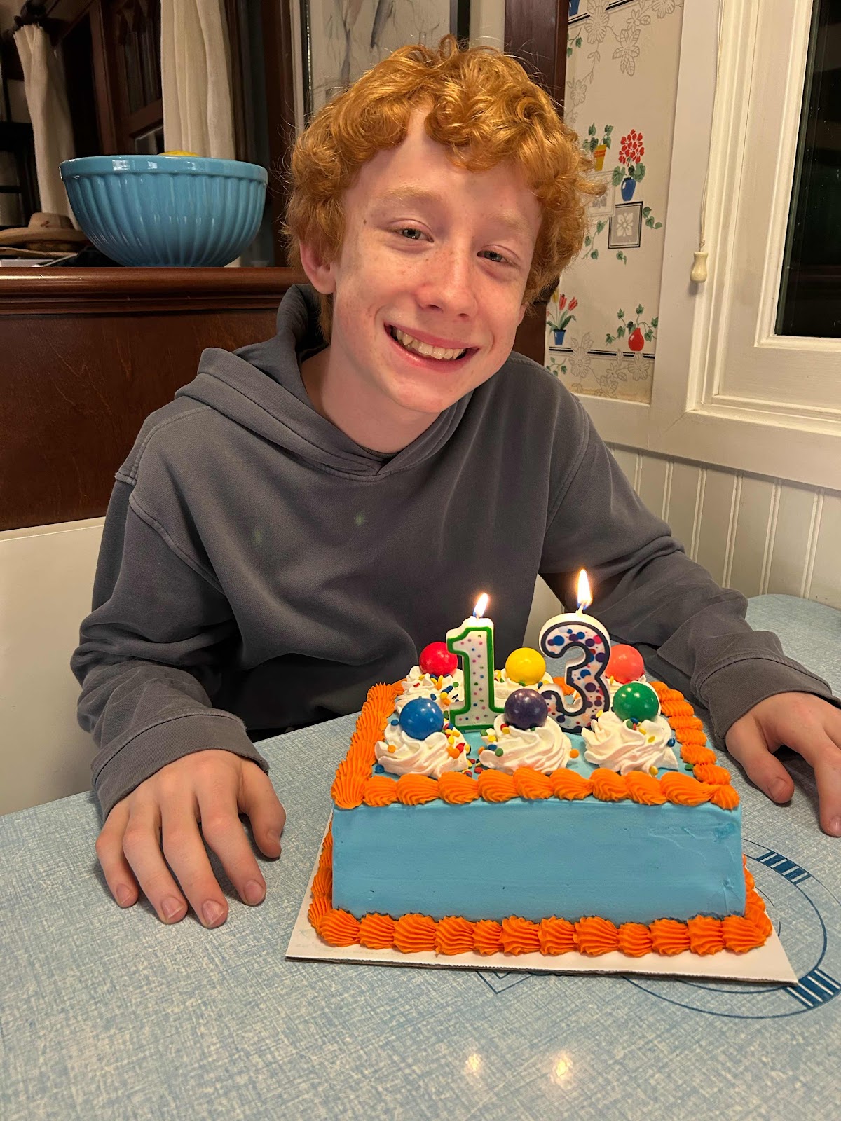 Bobby turned thirteen yesterday. When I went into their room to sing “happy birthday” in the morning, the first thing he said was, “I shouldn’t have to go to school,” and I can’t argue that one. Unfortunately, since he’s thirteen on a Monday, he’s going to spend pretty much his remaining childhood birthdays in school. Booo.