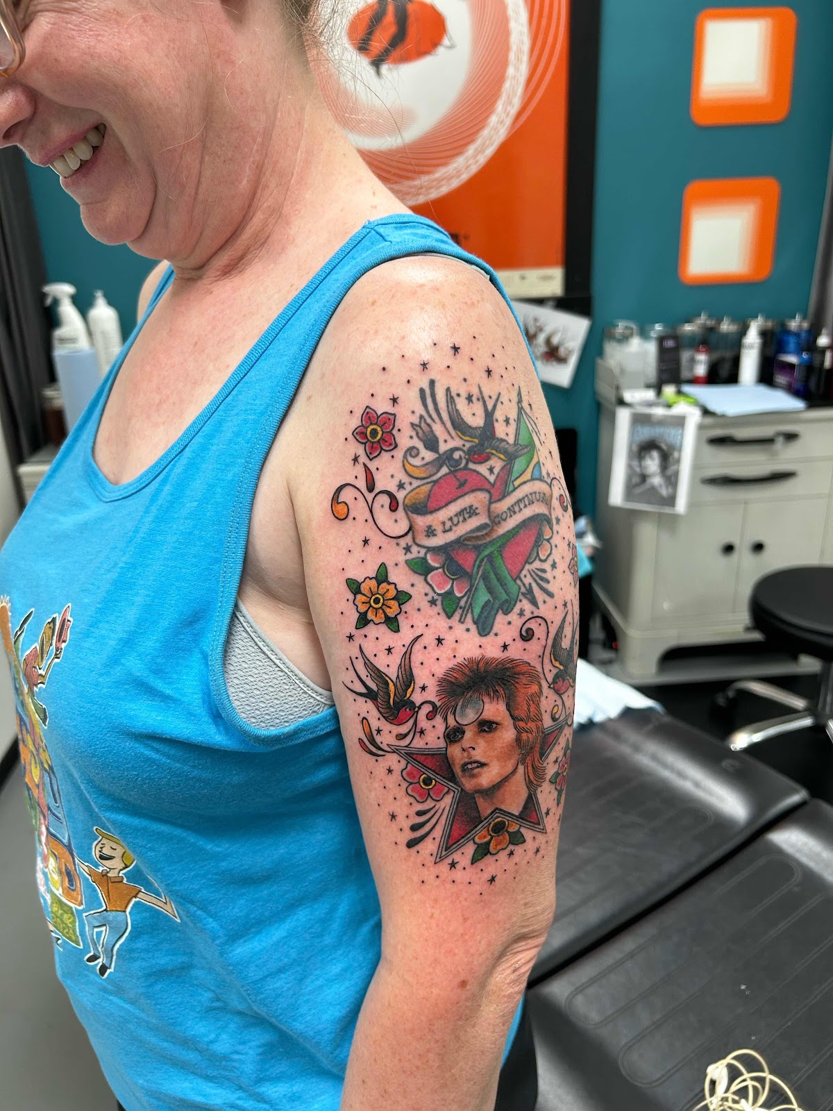 So what we did was combine elements of the first tattoo - traditional style elements - to make it look like they were intentionally grouped together rather than done years apart with no planning. It’s a bit of a bold move for me, since the idea behind the first tattoo was to hide it under a short sleeve most of the time, whereas this one will be visible most of the time. In other words, it’s more of a commitment to outing myself as a somewhat alternative person. This was a conscious choice. I’ve decided I want to be the kind of woman who has visible tattoos. This is a big shift in my life-long unwillingness to visibly identify with any particular group so I can always blend in unnoticed. Perhaps it’s just so true that as you get older you stop caring about that stuff and just want to do what you want to do. “Why shouldn’t we decorate ourselves?”, my tattoo artist said on our first meeting. Why not, indeed?